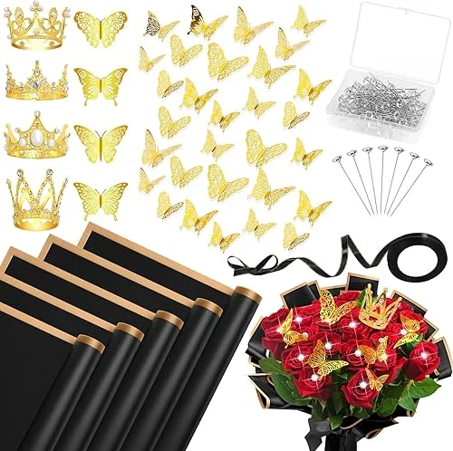 Tidponra 173Pcs Flower Wrapping Bouquet Paper Kit with 20 Sheets Waterproof Floral Wrapping Paper, 4Pcs Gold Crowns,48Pcs Butterfly and 100 Pcs Flower Pins for Flower Bouquets, Black