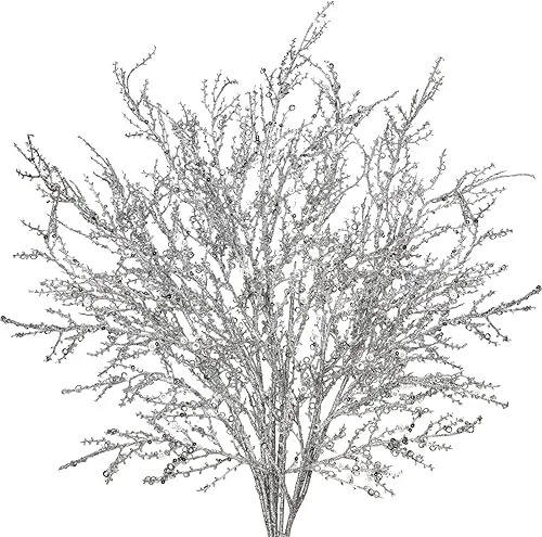 30.7′ Christmas Silver Glitter Stems, 5Pcs Artificial Spray Leaf Picks Tall Winter Branches for Christmas Tree DIY Xmas Wreath Garland Arrangment Vase Bouquets Table Centerpieces Decoration Silver