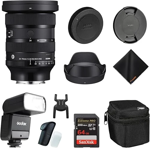 Sigma 24-70mm f2.8 DG DN II Art Lens Sony E, Full Frame Format, Six SLD Elements, Rounded 11-Blade, Godox Flash TT350S Mini, 64GB Extreme PRO Memory Card & Waith Cleaning Cloth (Bundle Set)
