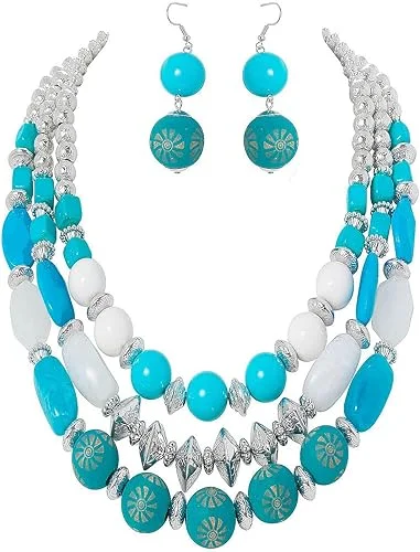 Bocar 3 Layer Chunky Statement Beaded Necklace and Earrings Set, Fashion Multi Layer Women Collar Necklace Jewelry Set