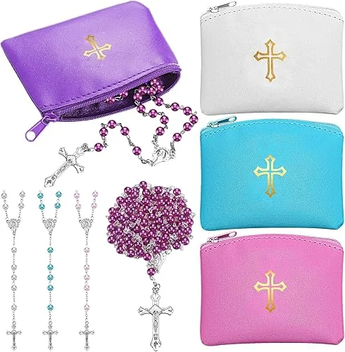Dansydaisy 8 Pcs Rosary Pouch with Catholic Rosary Beads Necklace Set for Women PU Leather Holder with Zipper and Gold Cross Imprint Case Portable Religious Bag for Travel(Elegant Colors)