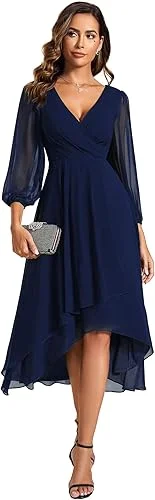 Ever-Pretty Women's Chiffon V Neck Long Sleeves Pleated A-Line Midi Length Wedding Guest Dress 01926