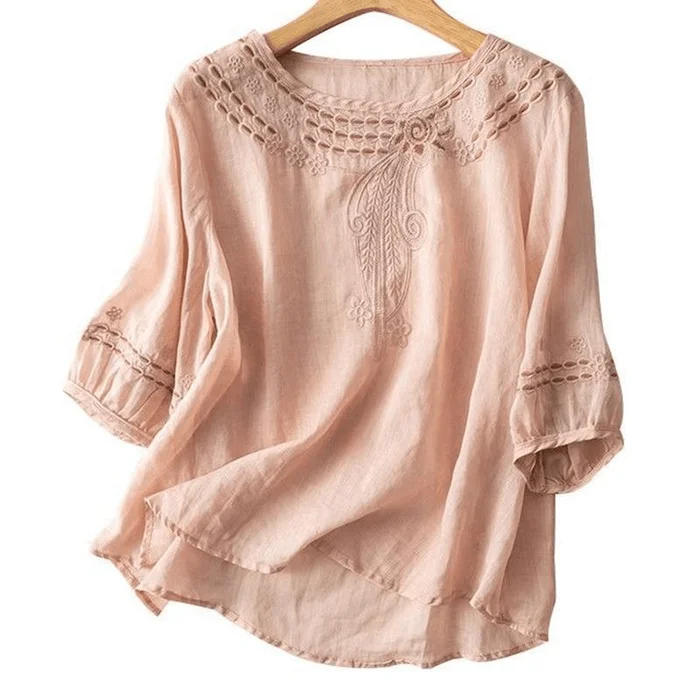 Women Vintage Cotton and Linen Embroidered Mid-sleeve T Shirt Pink L