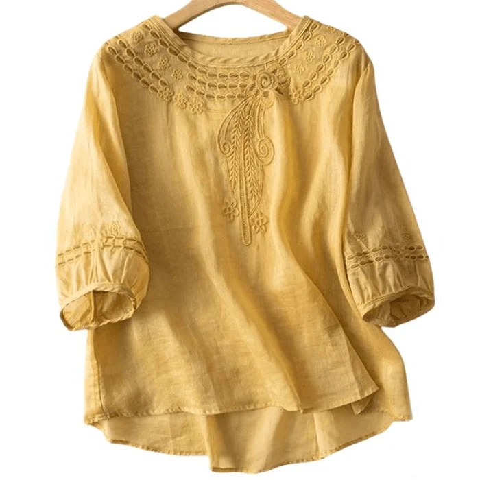Women Vintage Cotton and Linen Embroidered Mid-sleeve T Shirt Yellow M