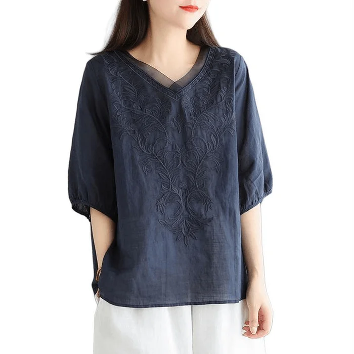 Women Vintage Cotton and Linen Embroidered V Neck Mid-sleeve Casual Shirt Navy M