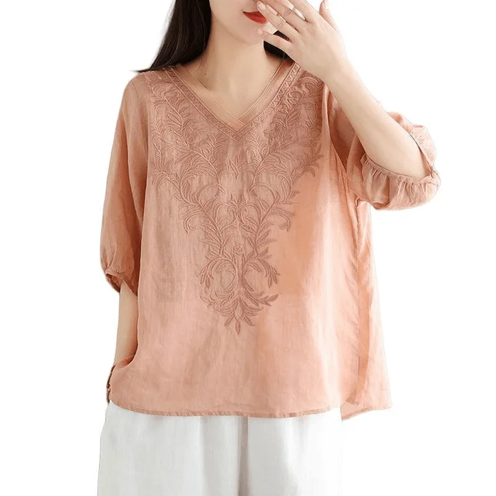 Women Vintage Cotton and Linen Embroidered V Neck Mid-sleeve Casual Shirt Pink M