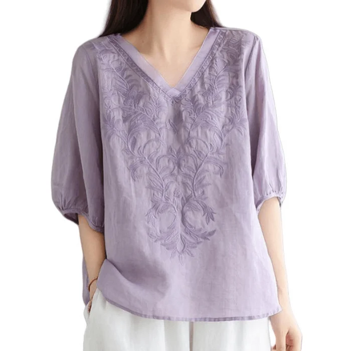 Women Vintage Cotton and Linen Embroidered V Neck Mid-sleeve Casual Shirt Purple M