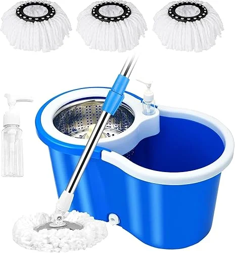 360 Spin Mop and Bucket System With 3 Microfiber Replacement Heads, Wringer Set for Home (Blue)