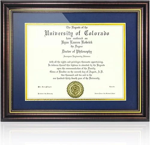 11×14 Diploma Certificate Frame or 8.5×11 Diploma Frame with Blue Over Gold Mat for Document / Certificate. Document Degree Frame with HD Plexiglass, Red Brown Finish with Gold Beads for Wall and