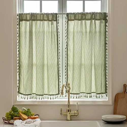 VOILYBIRD Kitchen Window Curtains Over Sink 30 Inch Length Boho Tassel Tiers Cafe Curtains Zigzag Design, 2 Panels, Sage Green