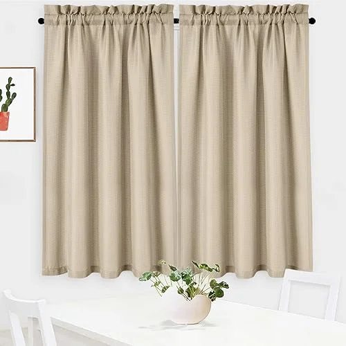 Waffle Woven Textured Short Curtains for Kitchen Waterproof Window Covering for Bathroom – 30′ x 45′, Plaza Taupe, Set of 2