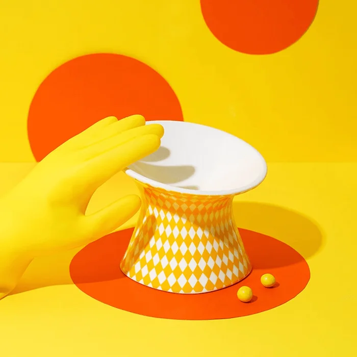 Yellow Geometry Ceramic Elevated Cat Bowl Small Cute
