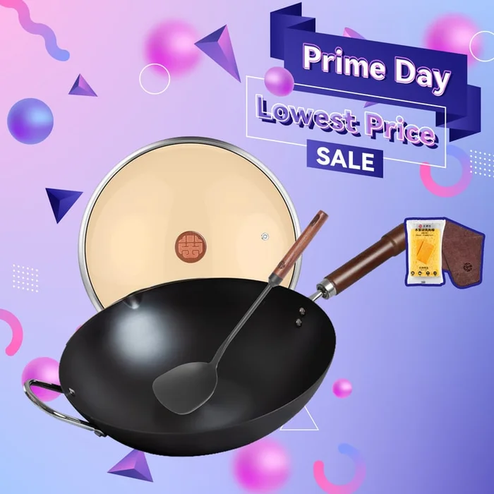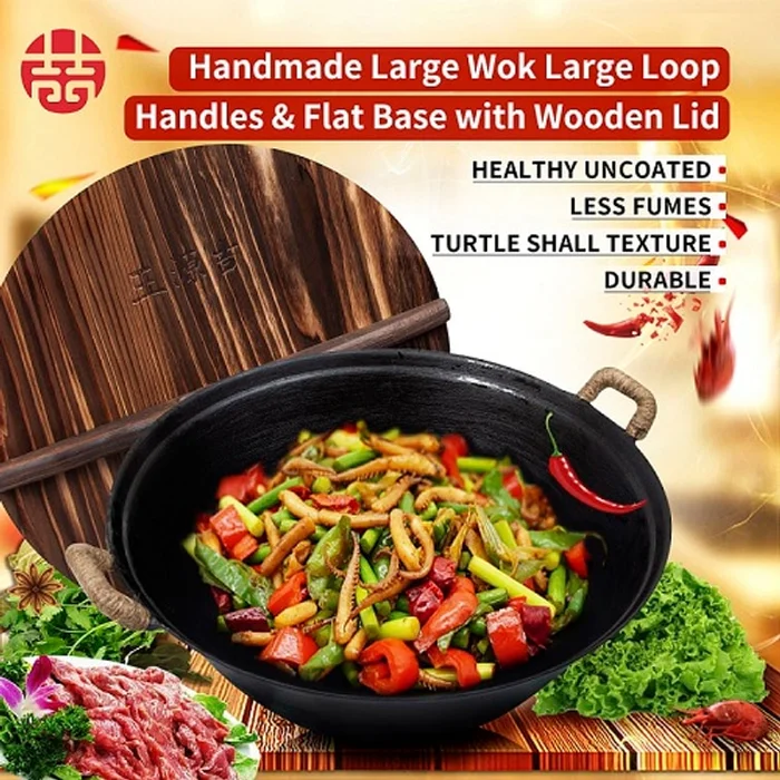 34CM Chinese Handmade + Spatula Set Cast Iron Wok Flat Bottom Stir Fry Pan For All Stoves