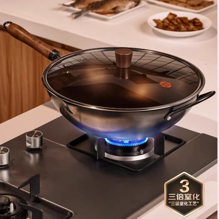 32CM Chinese Carbon Steel Wok + Spatula Set Carbon Steel Pan With Lid Flat Bottom No Chemical Coated For All Stoves