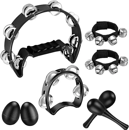 8 Pcs Tambourines for Adults Metal Jingles Hand Held Percussion Half Moon Tambourine, 4 Bells Tambourine, Wrist Bells, Egg Shakers, Sand Hammer, Hand Percussion Instrument Set for Party, KTV, Church