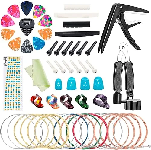 Acoustic Guitar Accessories Kit Guitar Strings Replacement Changing Tool Include Guitar Strings, Capo, Picks, Picks Holder, String Winder, Pins, Nuts Saddles for Guitar Players Beginners,58 Pcs