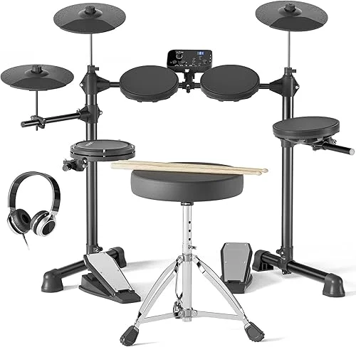 AODSK Electronic Drum Set for Beginner Kids with 150 Sounds,4 Quiet Drum Pads,2 Switch Pedal,Drum Throne,Drumsticks,On-Ear Headphone,AED-400