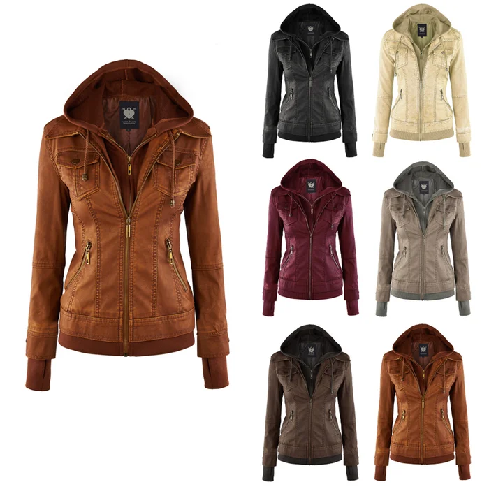 Women's Faux Leather Motorcycle Jacket with Hoodie