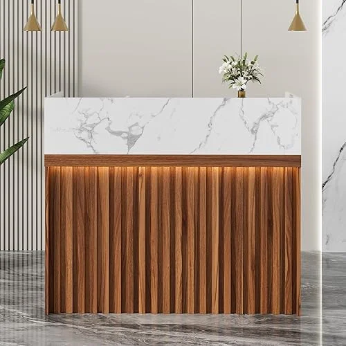 UEV Modern Reception Desk with Counter and Storage Shelves,with Marble Top Front & Led Lights,for Salon Reception Room,Checkout Office,Home Office
