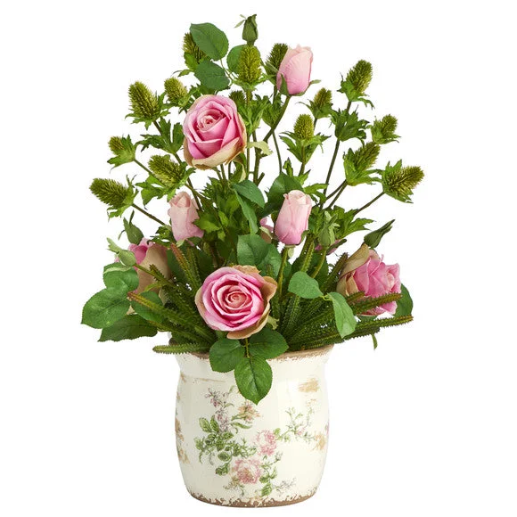 24″ Rose, Thistle and Succulent Artificial Arrangement in Floral Vase