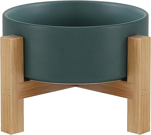 Raised Ceramic Cat Bowl – Cat Food Bowl with Bamboo Stand – Elevated Dog Food Dish for Puppies – Comfort Eating – 13.5 oz – 400 ml – Green