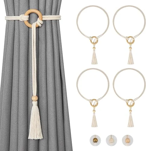 NICEEC 4 Pack Natural Cotton Rope Curtain Tiebacks Boho Style Decorative Drape Tie Backs Elegant Hand Woven Rope Curtain Holdbacks with Wooden Ring for Home & Office Window Drapery (B1-Yellow)