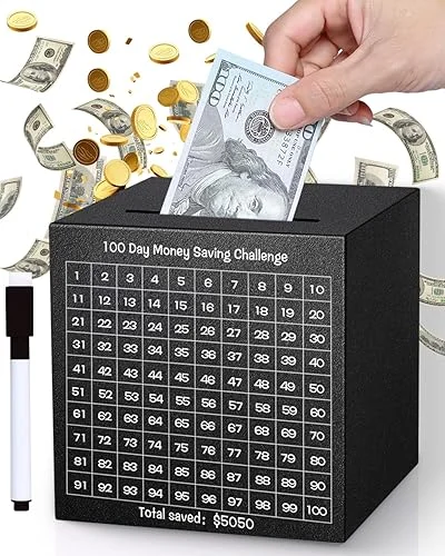 Money Saving Box, Unbreakable Piggy Bank for Adults Save $5,050 Metal Savings Box, 100 Day Money Saving Challenge Stainless Steel Box Must Break to Open 4.72 Inch (Black)