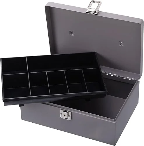Steel Cash Box with Combination Lock, Metal Small Money Organizer with Removable Money Tray,Cash Storage Box with Lockable Cover (Black – 11.8′ x 9.4′ x 3.5′)