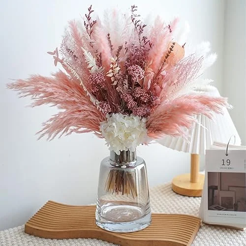 Natural Dried Pampas Grass Bouquet, Pink Flower Arrangements, Boho Home Decor Bouquet, Fluffy Pompas Grass Decor, Dried Floral Arrangement for Home Wedding Table Centerpiece Decorations