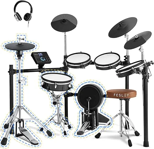 Fesley Electric Drum Set with Independent Hi-Hat Snare Drum: Full Size Electronic Drum Set with Mesh Dual Zone Drum Pad, Drum Set with Bluetooth MIDI Function, Throne, Headphones, Sticks, Black