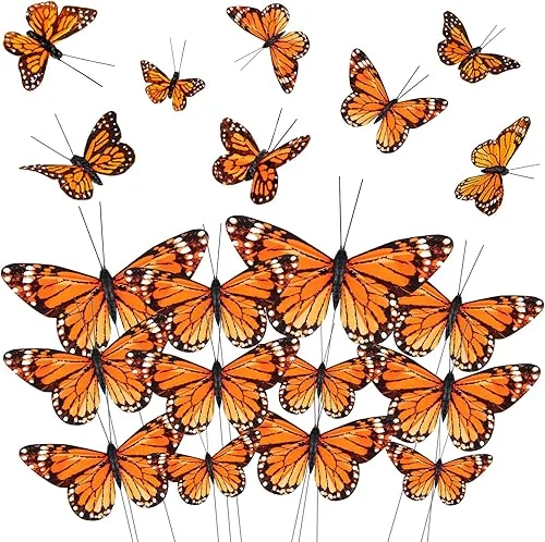 24 Pcs Monarch Butterfly Decorations 4 Size Artificial Monarch Feather Fake Butterfly Picks Crafts with Wire for Wall Flower Pot Spring Floral Party Home Decor(Orange)