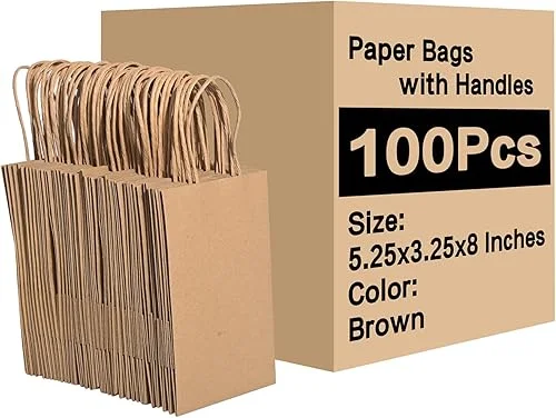 Brothersbox Small Brown Kraft Paper Bags with Handles 100PCS – 5.25*3.25*8 Inch Bags for Birthday Party Grocery Retail Shopping Business
