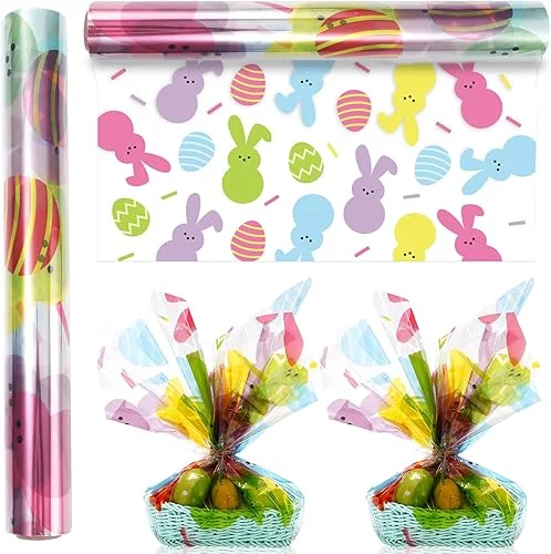 JarThenaAMCS Easter Cellophane Wrap Roll 100ft x 32 In 2.5Mil Colorful Eggs Bunny Cellophane Paper Crystal Clear Rabbit Cello Wrapping Paper for Spring Holiday Treats Gifts Basket Party Favor