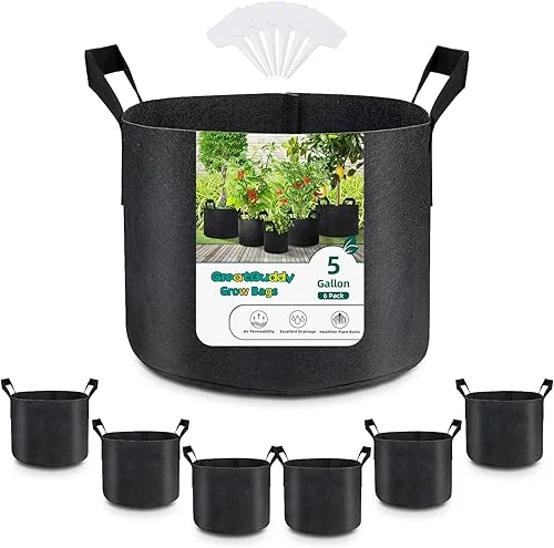 GreatBuddy 5 Gallon Grow Bags 6-Pack, Thick Fabric Pots for Plants, Sturdy Handles & Reinforced Stitching, Labels Included, Black