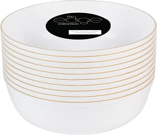 PLASTICPRO [30 Pack 16 OZ Bowls] Edge Collection White with Gold Rim Plastic Party Soup Bowls Premium heavyweight Elegant Disposable Tableware Dishes