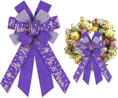 ALIBBON Large He is Risen Bows for Wreaths, Easter Wreath Bows, Purple Bows for Front Door, Easter Christmas Decor, Religeous Cross Burlap Bows for Spring Wreath Indoor Outdoor Decoration