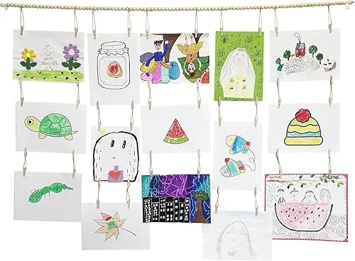 Art Display for Kids Artwork,Hanging Photo Display with 36 Clips, Boho Wooden Beads Kids Art Frame Display Holder for Classroom, Playroom, Bedroom Wall Decor