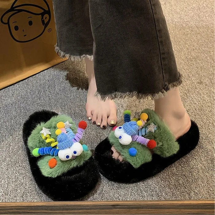 New Cartoon Fur Home Anti Slip Cotton Slippers In Green 35(35-36)