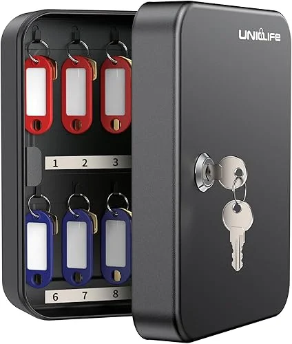 Uniclife 20 Position Key Cabinet with Key Lock Wall Mounted Black Security Storage Box Steel Key Organizer with Colorful Key Tag Labels Stickers and Hooks