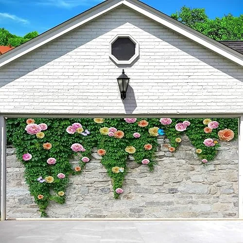 Green Leaves Flower Garage Door Decorations Cover, Spring Vintage Brick Stone Wall Green Leaves Vine Floral Greenery Garage Door Banner Backdrop, Garden Nature Party Decor Banner Cover, 13X6FT