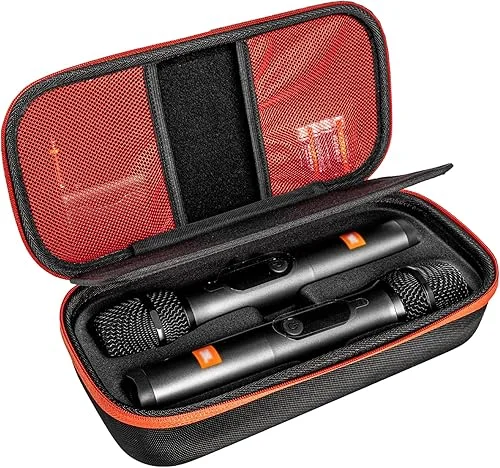Wireless Microphone Travel Case – Dual Mic Storage with Shock-Proof Design, Handle, Mesh Pocket for Adapters, AA Batteries – Ideal for Karaoke, Singing & Partybox Microphone Accessories – Black