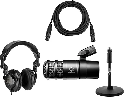 Audio-Technica AT2040 Hypercardioid Front-Address Dynamic Podcast Microphone, Bundle with H&A Tabletop Microphone Stand & Studio Monitor Headphones