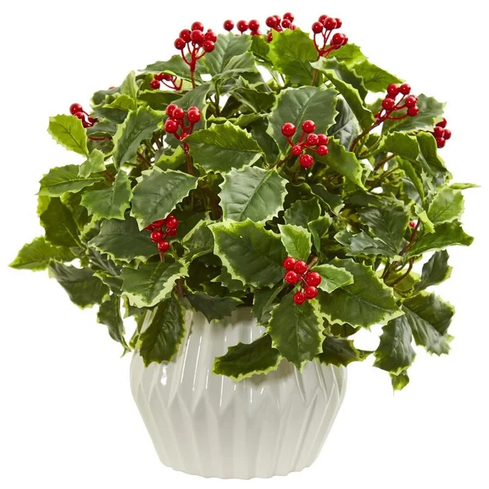 15′ Holly Leaf Artificial Plant in White Vase (Real Touch)