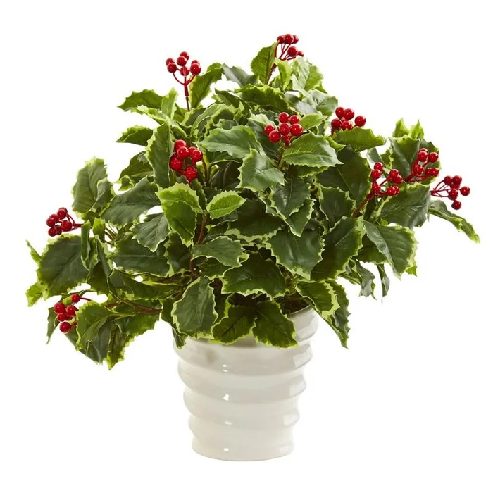 Variegated Holly Artificial Plant in White Vase (Real Touch)