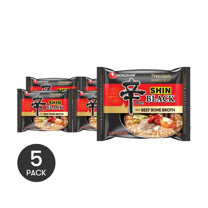 Shin Black Ramyun – Instant Noodles with Beef Bone Broth Flavor , 4.58oz *5【5 Packs】