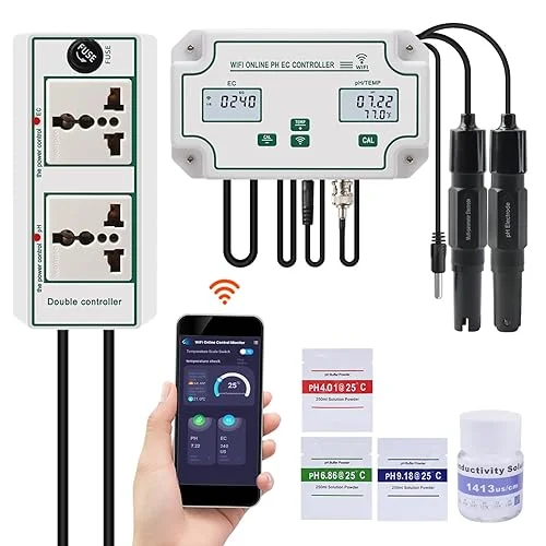 WiFi pH EC Monitor, 24/7 Online EC PPM pH Mete Hydroponic Nutrients Monitor, APP Online Nutrient Meter with Data Logger Function for Nutrient Reservoir Water Tank DWC Indoor Garden