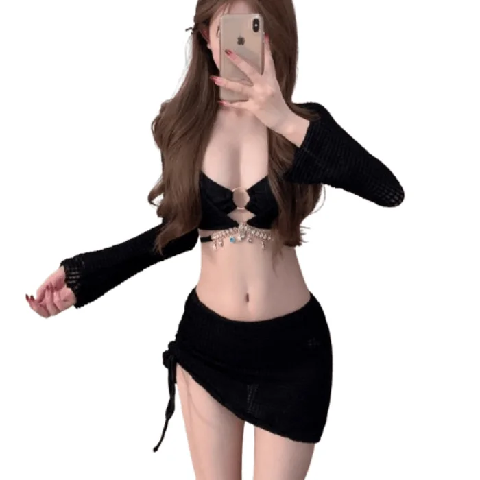 Bikini four-piece split skinny soaking spa floral small breast gathered black L size