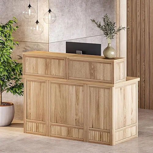 LITTLE TREE 57-inch Reception Desk with Counter,Boho Front Desk Receptionist Desk, Modern Welcome Desk Checkout Counter for Office, Retail, Lobby,Salon,Oak