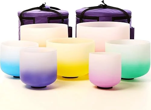 Leize Chakra Tuned 432hz Set of 7 Gradient Color Quartz Crystal Singing Bowls 6-12 inch with Heavy Duty Carrying Cases and Singing Bowl Mallets