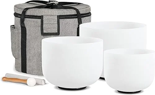 Set of 3 PCS 440HZ 6′ A Note 8′ F Note and 10′ C Note Frosted Chakra Quartz Crystal Singing Bowl with Carry Case Bag for Sound Healing Meditation